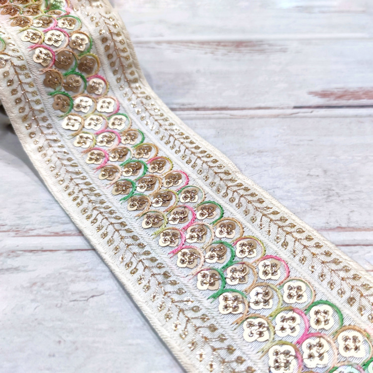 نوار سوزندوزی هندی پهن،با عرض ۷سانت و کیفیت بالا،گلدوزی و پولک دوزی روی زمینه سفید نخ پنبه،موجود می باشد