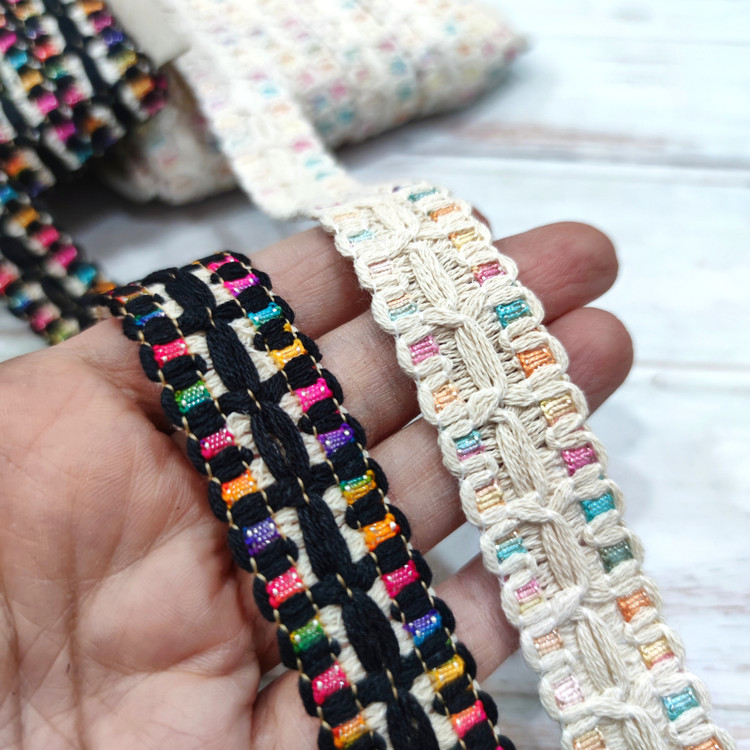 نوار خرجکار کتان کنفی طرحدار زیبا،با کیفیت بالا و در دو زمینه ی مشکی و شیری موجود میباشد