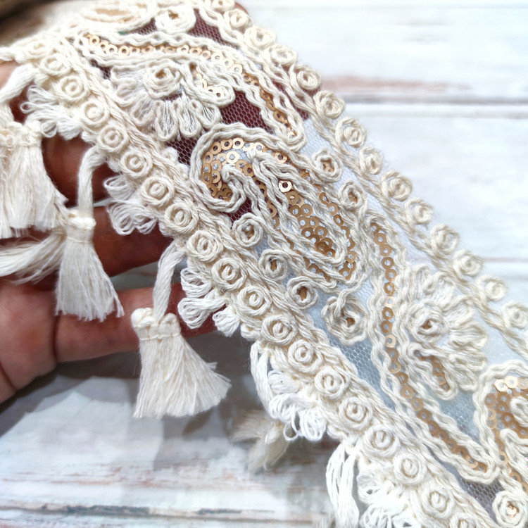 نوار خرج کار کتان کنفی منگوله دار هندی،پولک دوزی شده،به رنگ شیری،با عرض ۱۰سانت موجود میباشد