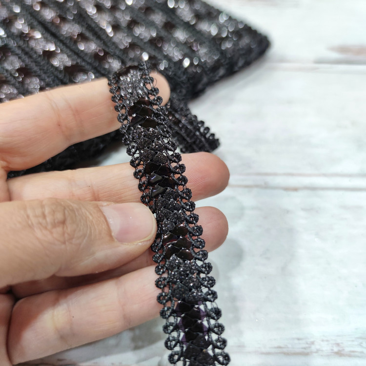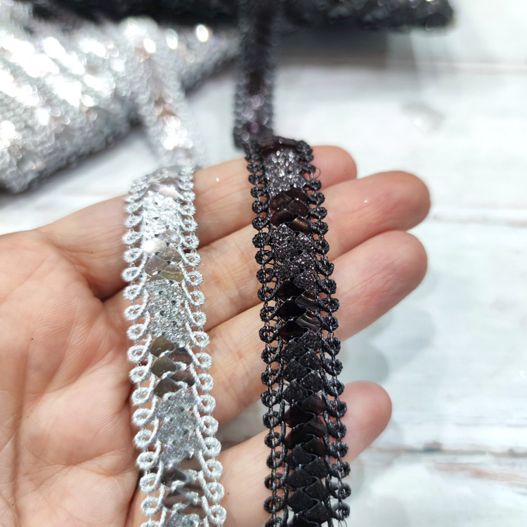 نوار یراق باریک با پولک مربع شاین دار،در دو رنگ مشکی و نقره ای مناسب استفاده بر روی انواع لباس،چادر و روسری و شال،کیف و کفش و صندل و انواع تزئینات میباشد