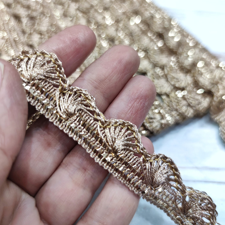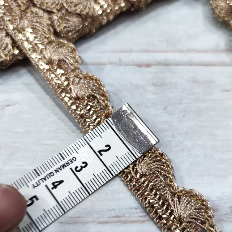 نوار خرجکار حاشیه طلایی دو سانتی با تم طلایی متمایل به رزگلد،مناسب کار بر روی انواع لباس و روسری میباشد