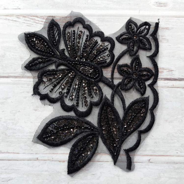 نوار یراق گلدوزی پهن مشکی،کار شده با منجوق و ملیله و پولک،با کیفیت عالی(ترک)،به شکل متری و اپلیکه ای موجود میباشد