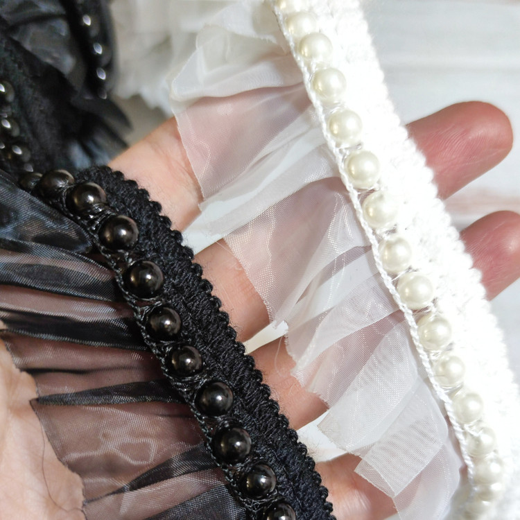 نوارهای خرجکار پلیسه مرواریدی،با تور ساتنی با کیفیت پلیسه شده و لبه ی کار مروارید دوزی شده است،عرض نوارها ۴سانت و در دو رنگ سفید و مشکی موجود میباشند که مناسب کار بر روی انواع لباسها خصوصا در قسمت لبه آستین و یقه،پایین لباس،لبه شال و روسری ،کار بر روی کیف و کفش و صندل و سایر تزئینات میباشد