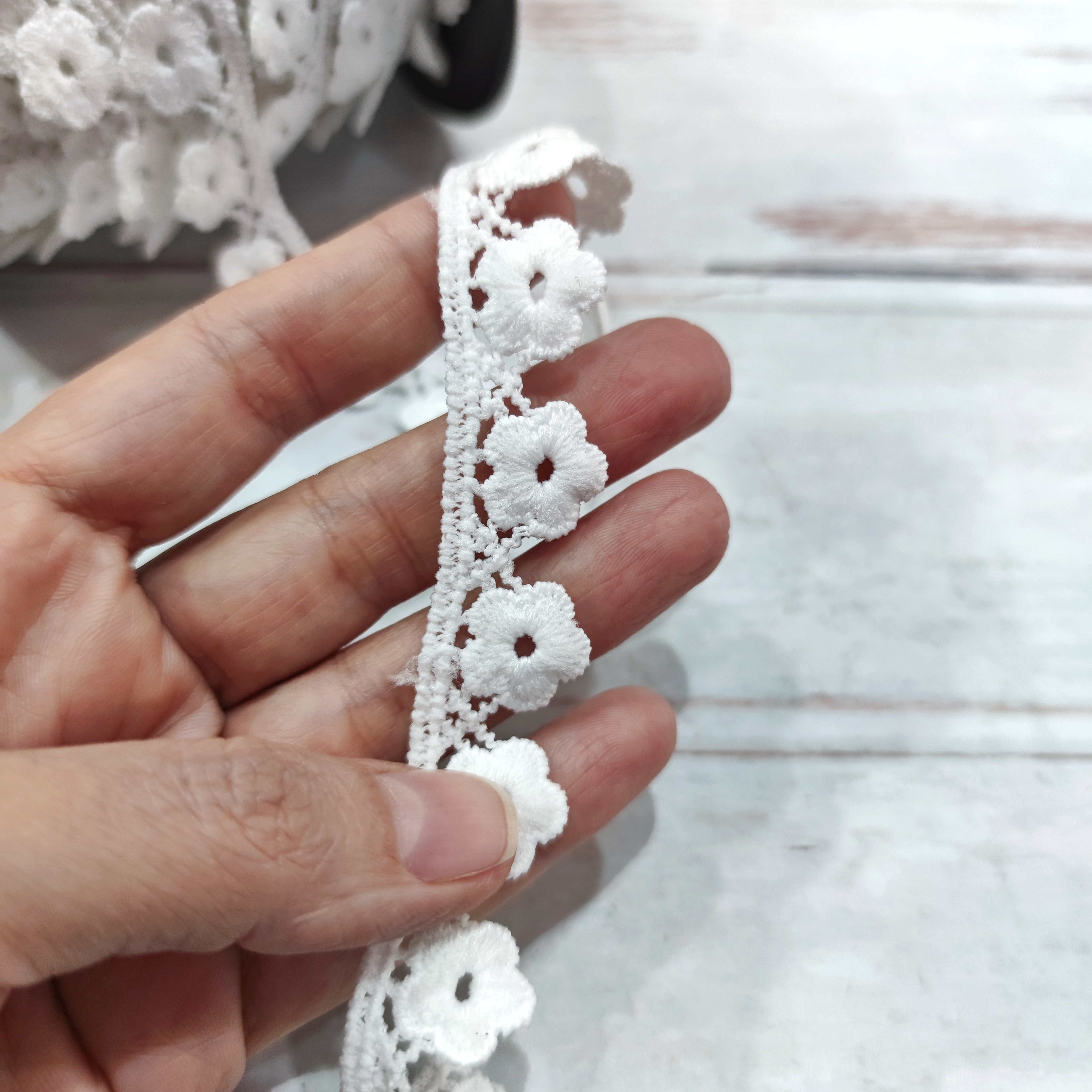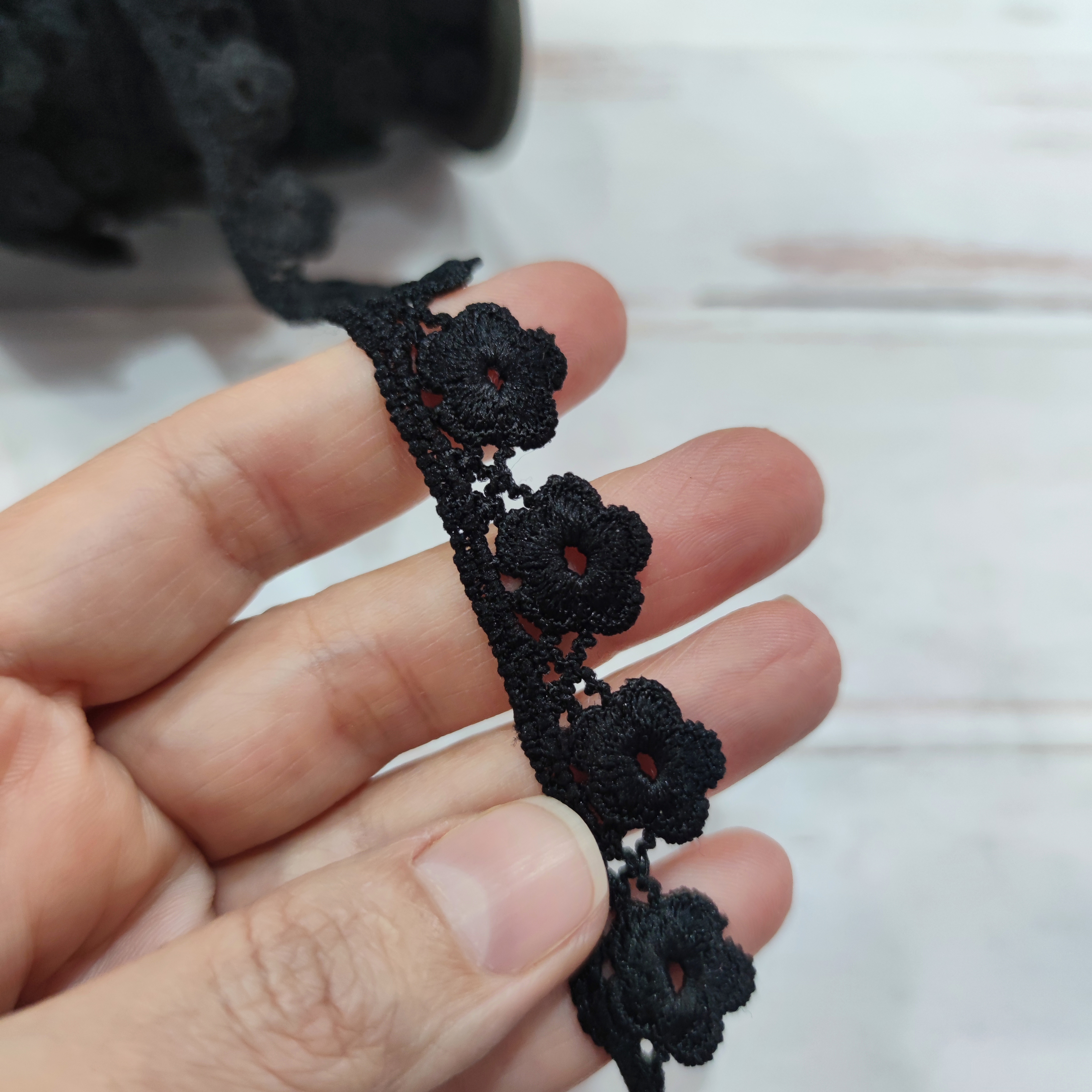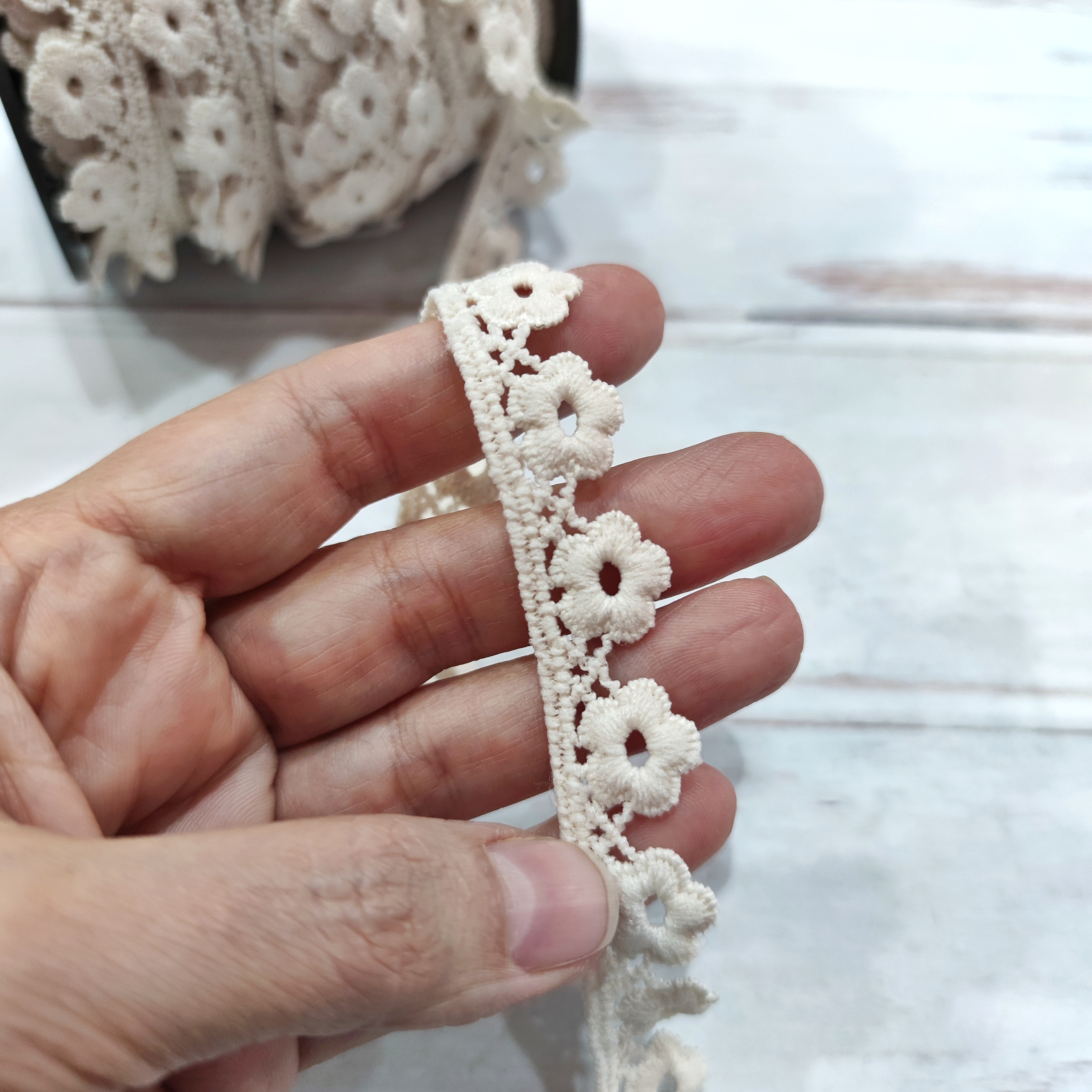 نوار خرجکار تزئینی لباس،با طرح شکوفه و جنس کتان نخ ظریف ،در سه رنگ سفید و مشکی و کرم با عرض ۱/۵سانت (باریک) مناسب دوخت بر روی لباس موجود میباشد موجودی به متر است.